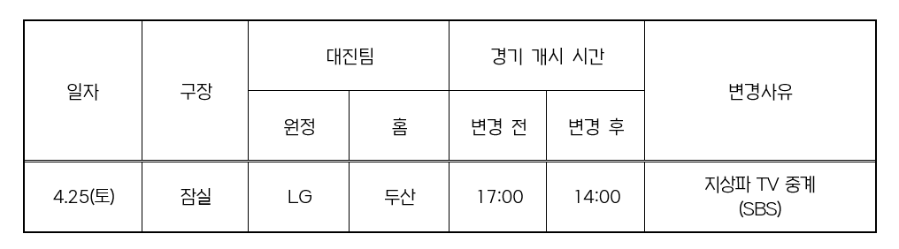 2026 KBO 리그 경기 중 일부 경기의 개시 시간이 다음과 같이 변경됐다.